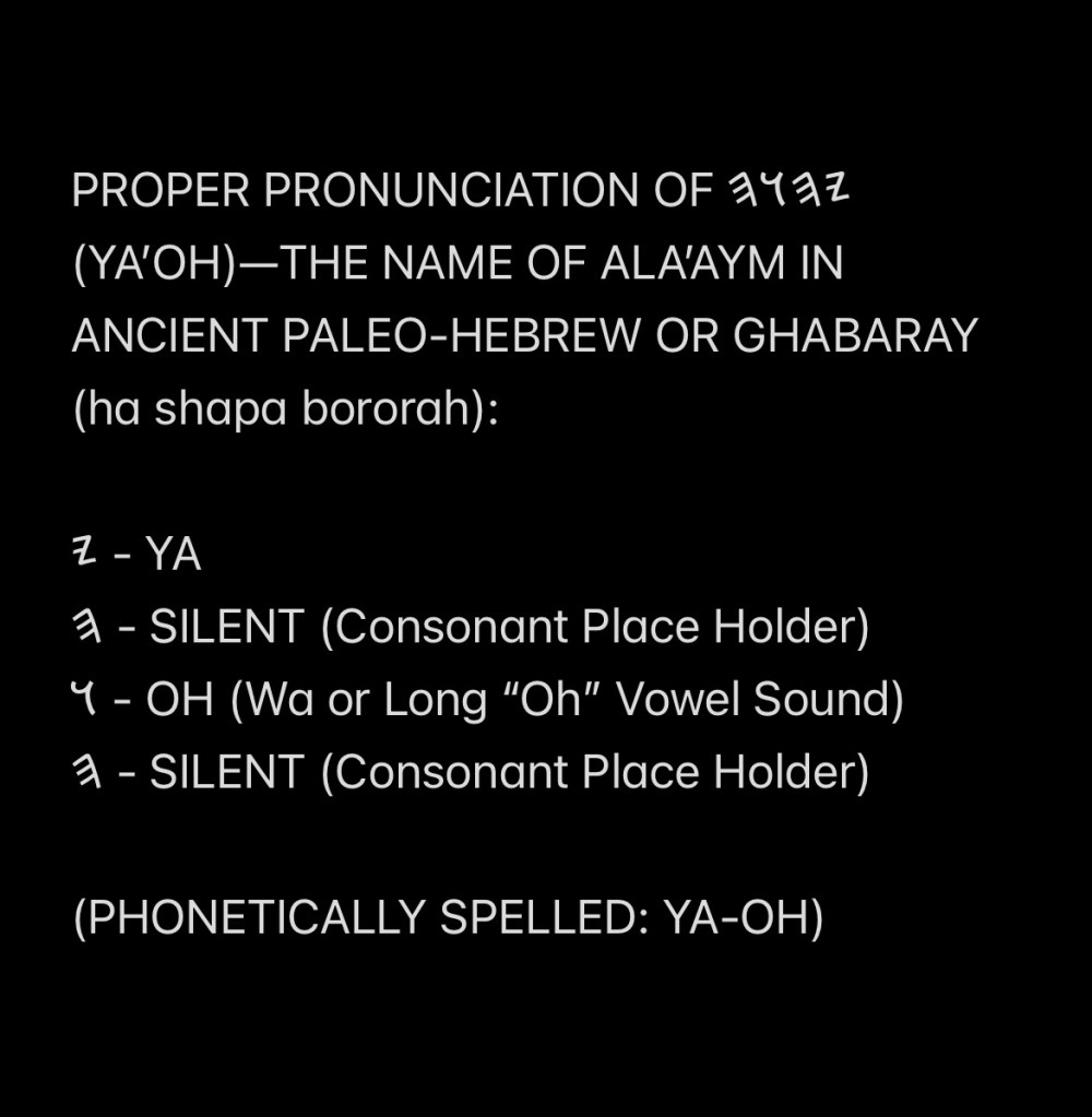 - YA’OH (𐤉𐤄𐤅𐤄) — The true name of Ala’aym, the Almighty Father (Abayno), derived from the Ancient-Paleo-Hebrew, the original source language of the Hebrew Peoples, Anakhno Ghabaraym https://blogwithrealrevolutionradio.com/2024/11/28/yaoh-𐤉𐤄𐤅𐤄-is-the-fathers-true-name-in-ghabaray/