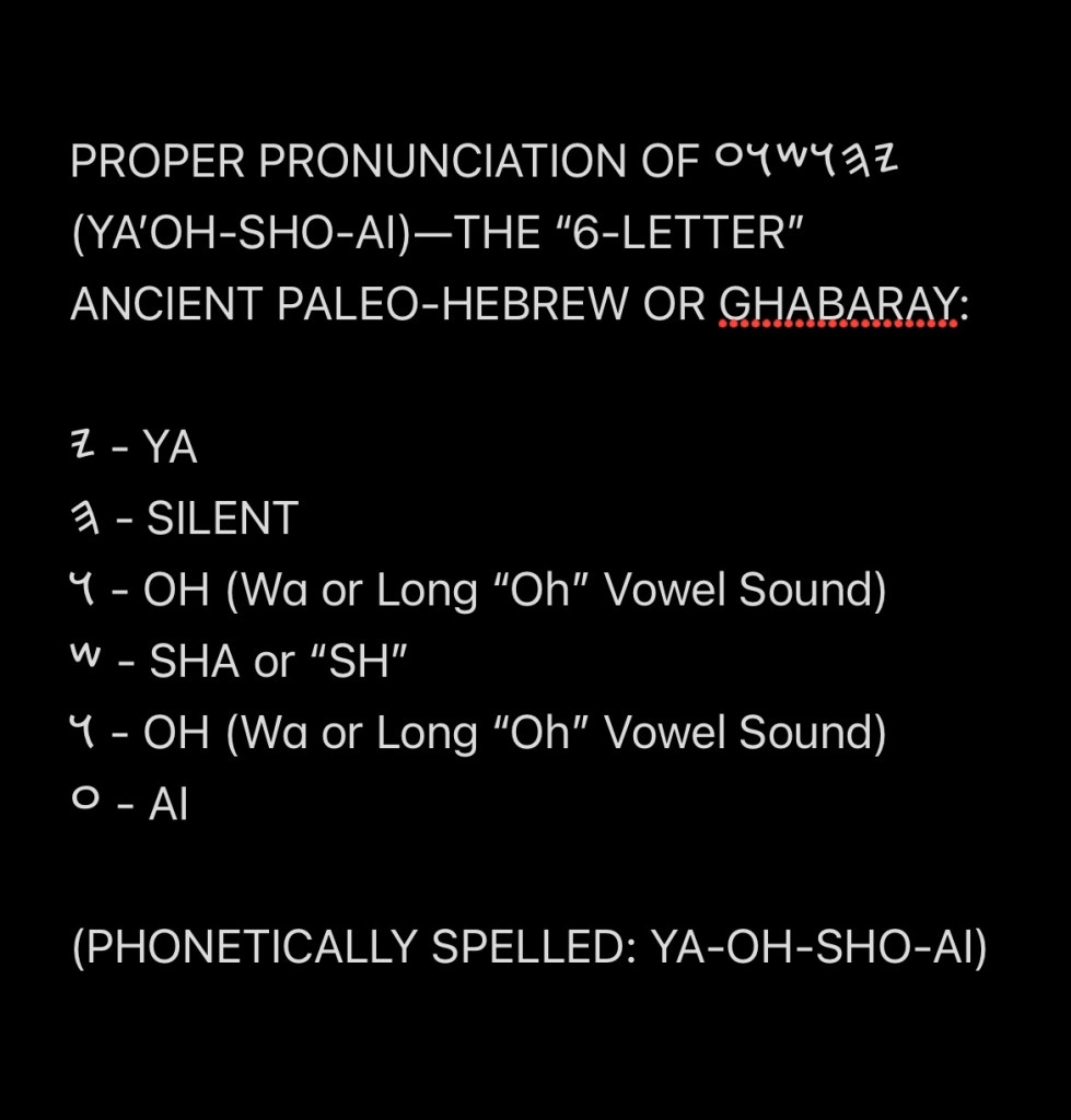 Now, to be theologically correct, instead of referencing Ha’Maschiach (Mashaykh) as the inappropriate Caananite-Babylonian translation as “Yahushua” and even to some degree among other deceived proponents of “Yahusha“ within the severely divided Hebrew Roots community, we will reference Maschiach or Mashaykh (the correct pronunciation/spelling of the Messiah in ancient Paleo-Hebrew or Ghabaray) as Ya’oh-sho-ai (𐤉𐤄𐤅𐤔𐤅𐤏). Once more “Ya’oh-sho-ai”, as previously mentioned, is the correct pronunciation/spelling (the transliteration) of the Messiah (Mashaykh) in ancient Paleo-Hebrew or Ghabaray.