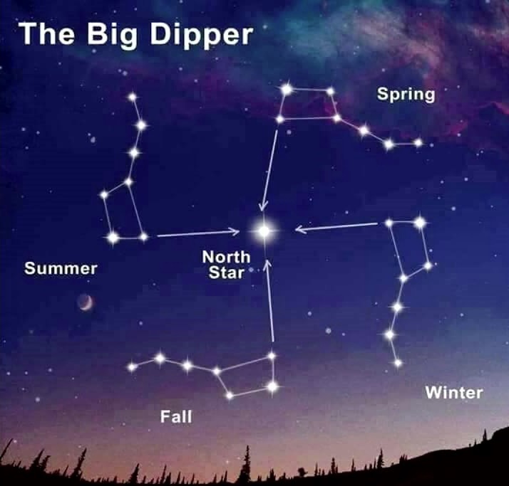 - Ursa Major pointing to the North Star (Polaris) connecting with Arcturus and Arcturus connecting with Deneb?